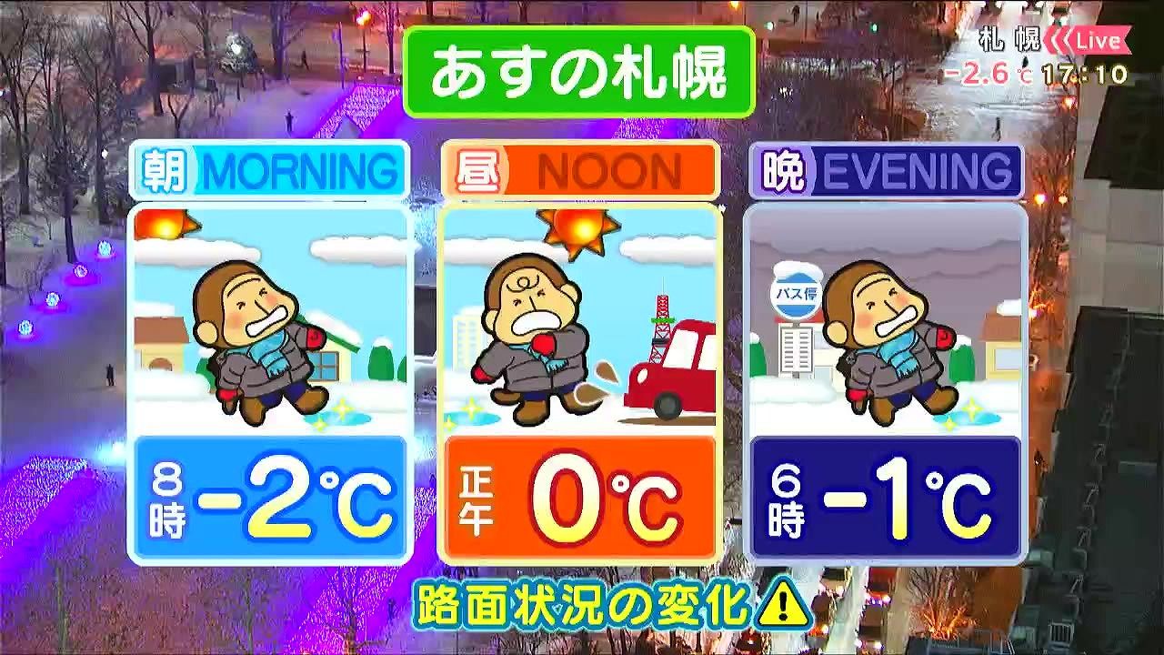 もんすけ、転びそうになってます。あす10日(水)の札幌は晴れ間が出ますが、寒さが続くため、歩道は昼間でもツルツル路面になりそうです。日が差すと大きな通りなどは雪がとけて水たまりができるため、路面状況の変化に注意して下さい。