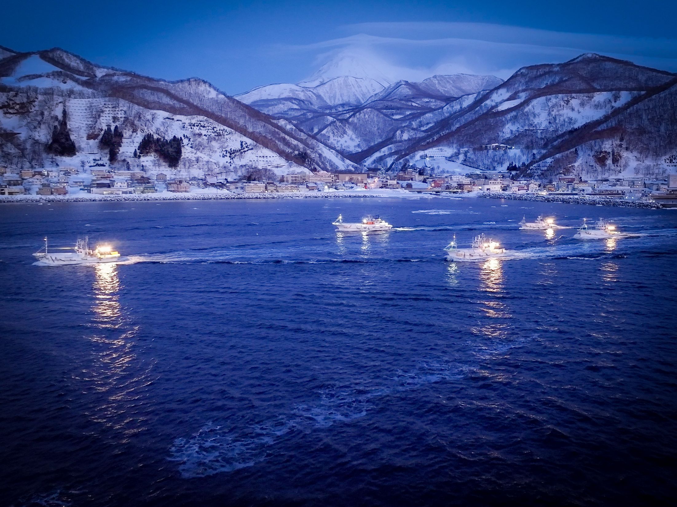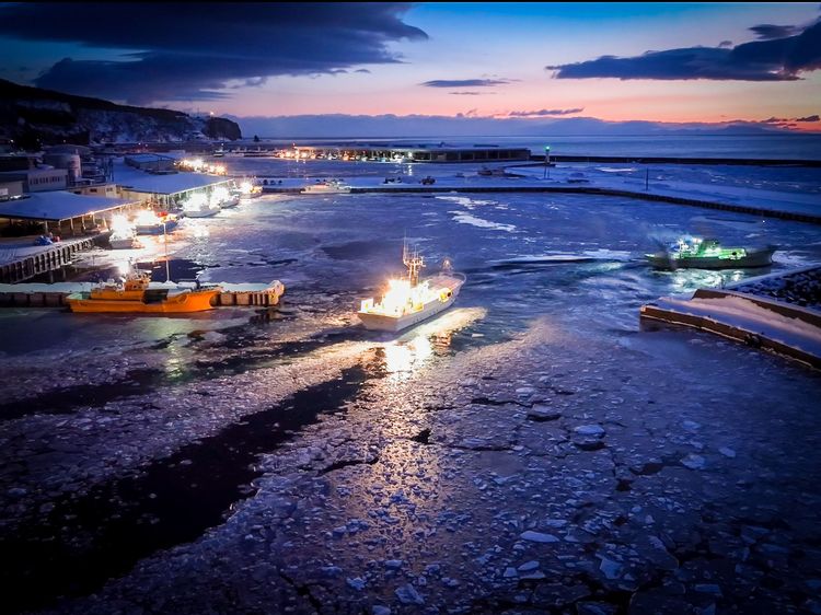 夜明け前、気温-10度前後の極寒のなか、漁師たちは日の出とともに出港し、前日に入れておいた刺し網を、流氷に船体をぶつけないよう巧みに操船しながら、何時間もかけて巻き上げていきます。