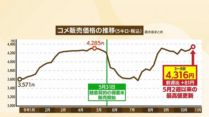 11月9日までの1週間に全国のスーパーで販売されたコメ5キロあたりの平均価格は、前の週から81円上がって4316円となり、半年ぶりに最高値を更新しました。