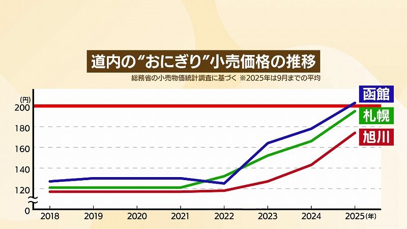 おにぎり1個あたりの平均価格は、この5年で大きく上昇。函館ではことしの平均価格で200円台に突入。札幌も200円に迫る勢いです。