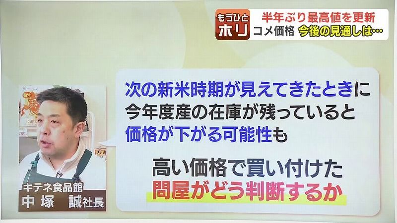 コメの小売業者などでつくる団体は、新米の収穫量が高水準になる見通しであることから、向こう3か月の価格の見通しとして値下がりする「先安感」が強まるとしていますが、キテネ食品館の中塚社長はこんな話をしています。