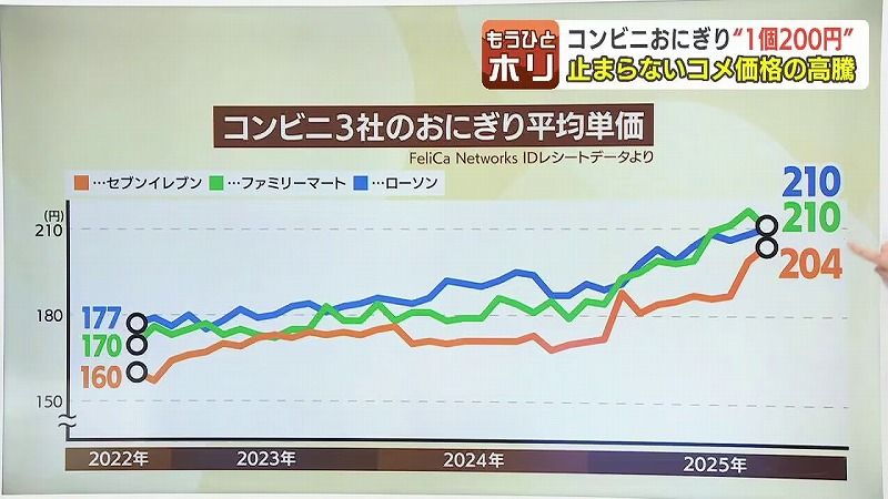 大手コンビニエンスストアの価格をみてみると、高級路線のおにぎりなど、各社の商品ラインナップによっても変わりますが…3年前は、おにぎり1個=160円から170円台だったものが徐々に価格が上がり、ことし6月以降、各社200円を超えています。