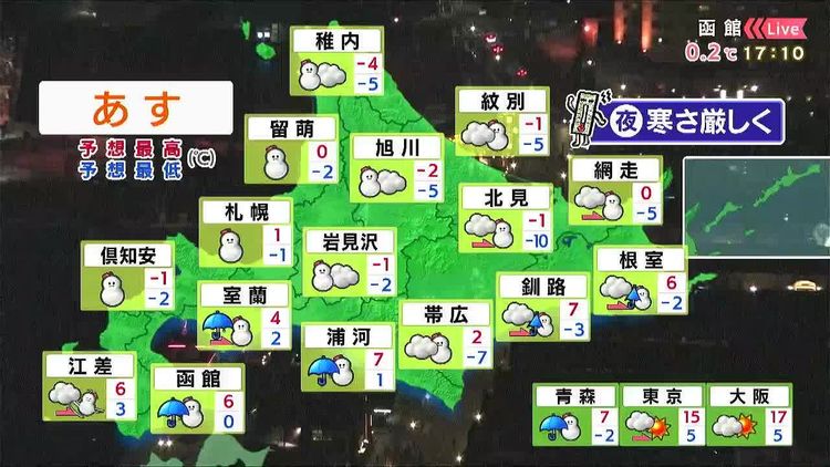 全道的に雪や雨が降り、風も強まるでしょう。大雪や吹雪、なだれにも注意して下さい。最高気温は稚内で-4度と厳しい寒さ。その他も夜は急速に寒くなるでしょう。