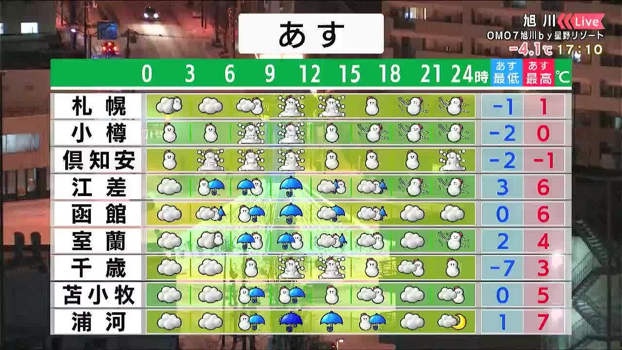 札幌は昼頃から一気に積雪が増え、小樽や倶知安は大雪になるでしょう。千歳も昼頃は雪が強まります。函館や浦河は雨の降る時間があるでしょう。
