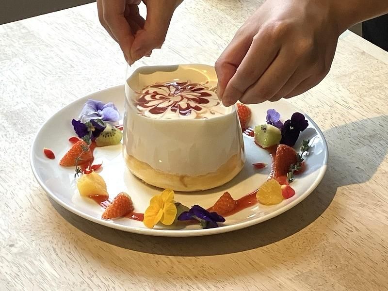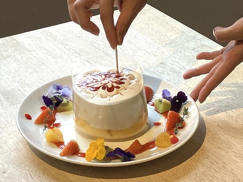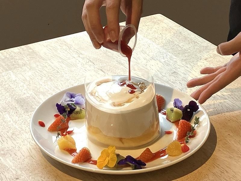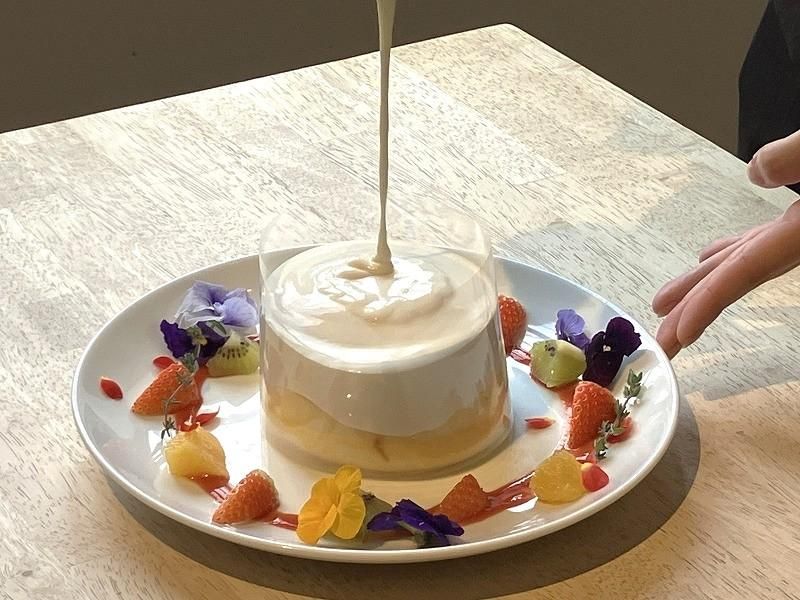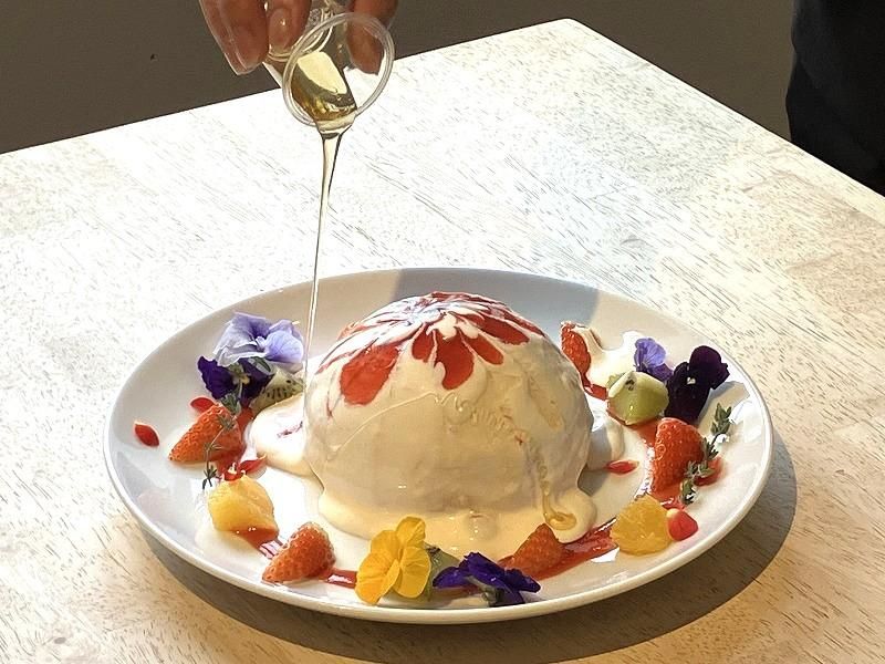 クリームとソースがふわっと広がります。最後にシナノキのはちみつをかけて完成です。