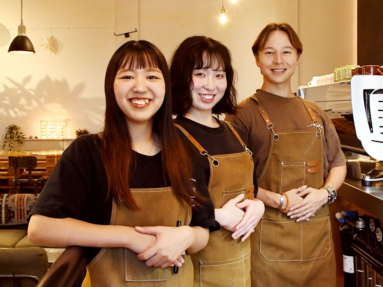 どっしり重厚ですが、バニラアイスのおかげで意外とさっぱり。「絶対にアイス乗せがおすすめ」とスタッフ・アオイさん(写真左)のお墨付きです。深煎りコーヒーとどうぞ。450円。アイス乗せは750円。