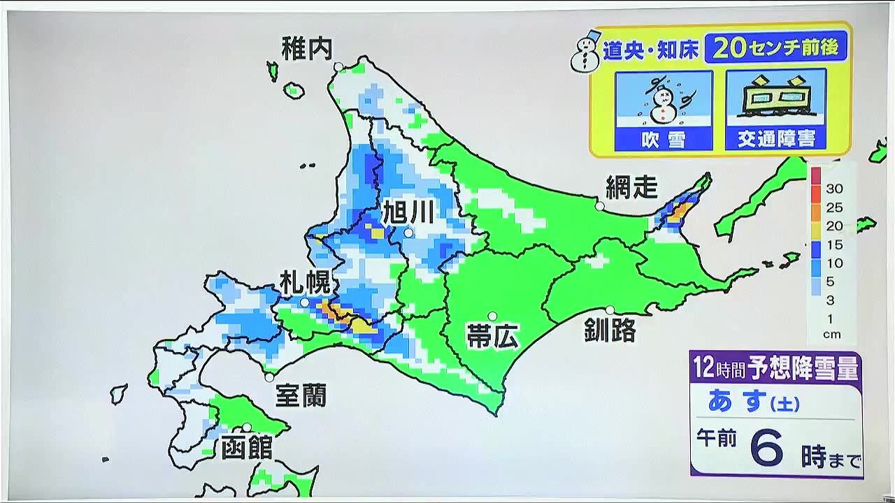 あす13日(土)午前6時までの12時間に、黄色やオレンジのエリア、北空知の深川、南空知の長沼町から胆振東部の安平町周辺、知床半島周辺で20センチ前後です。札幌でも10センチ前後降るおそれがあるので、交通障害にも引き続き注意してください。