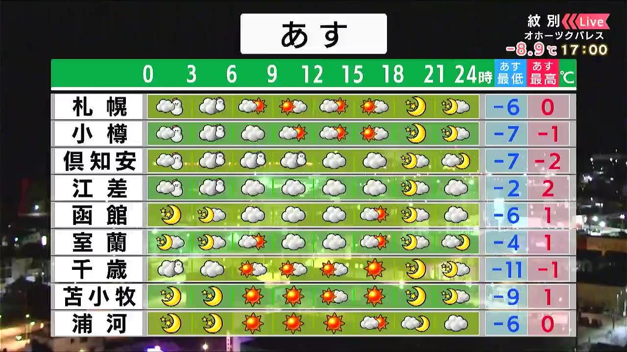 あす13日(土)の時間ごとの天気。道央・道南からです。