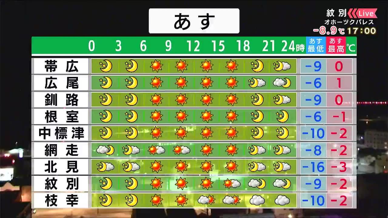 知床半島周辺で昼頃まで雪が降る他は晴れるでしょう。日曜午後から大荒れの天気となります。車のガソリンを満タンにしておくなど、早めに対策をしておきましょう。