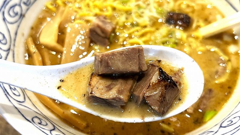 ごろごろっと入っている、角切りの牛たんチャーシューは、とってもやわらかくて、ほっぺがとろけそう…!