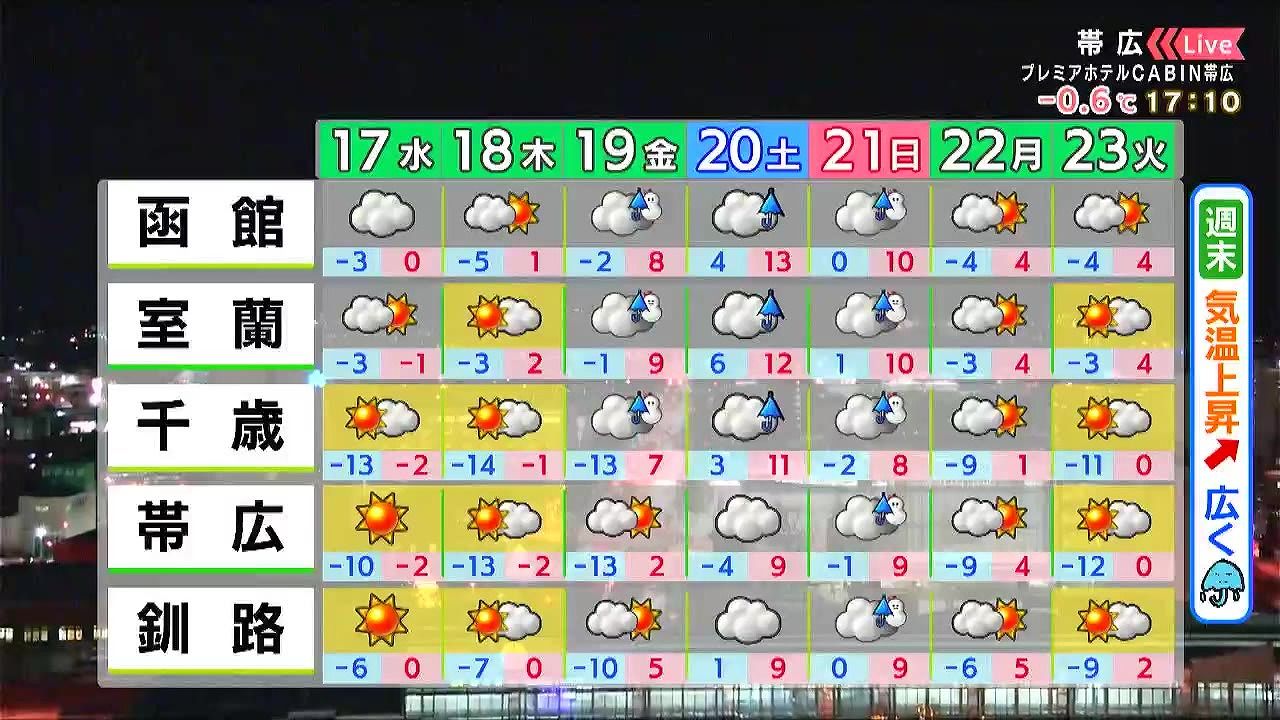 ※16日午後5時時点の情報です。最新の気象情報は、HBCウェザーセンターのホームページなどでご確認ください。HBCは気象庁の認可を2001年に得て以来、民間気象会社の一つとして「HBCの独自予報」を発信しています。