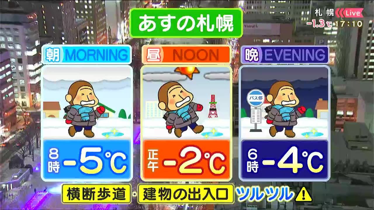あすも足元はツルツル。そして寒そうですね。5日ぶりに最高気温でもマイナスの真冬日になります。しっかり寒さ対策をしてください。