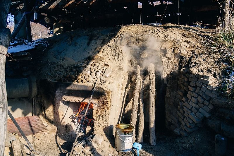 窯場にお邪魔すると、一層炭火の香りが強くなり、パチパチと火を炊く音が聞こえ、釜から煙がモクモクと上がっています。