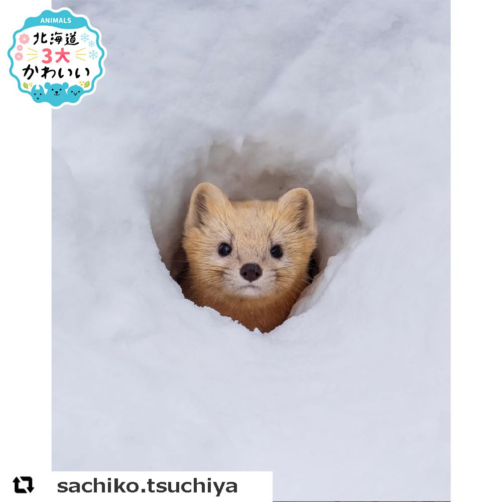 雪のトンネルから、かわいらしい顔を見せているのはエゾクロテンです。