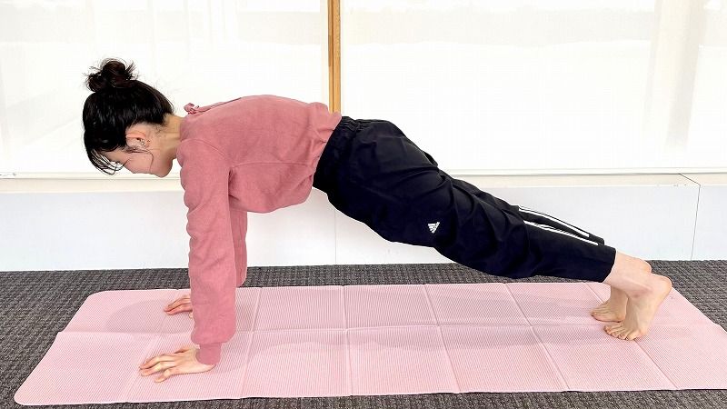 鼻から息を吸って、体を前にスライド。足の甲を床につけ、ひじを伸ばす。