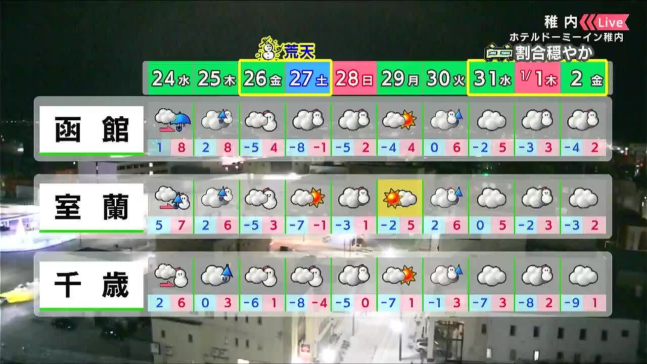 26日金曜から27日土曜は警報級の猛吹雪となるおそれがあります。年末年始は荒れる可能性は低いですが、湿った雪が降るでしょう。