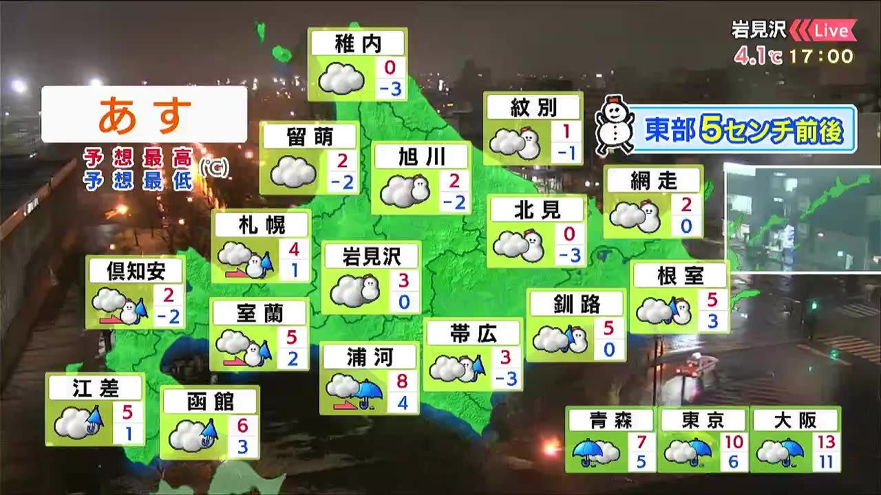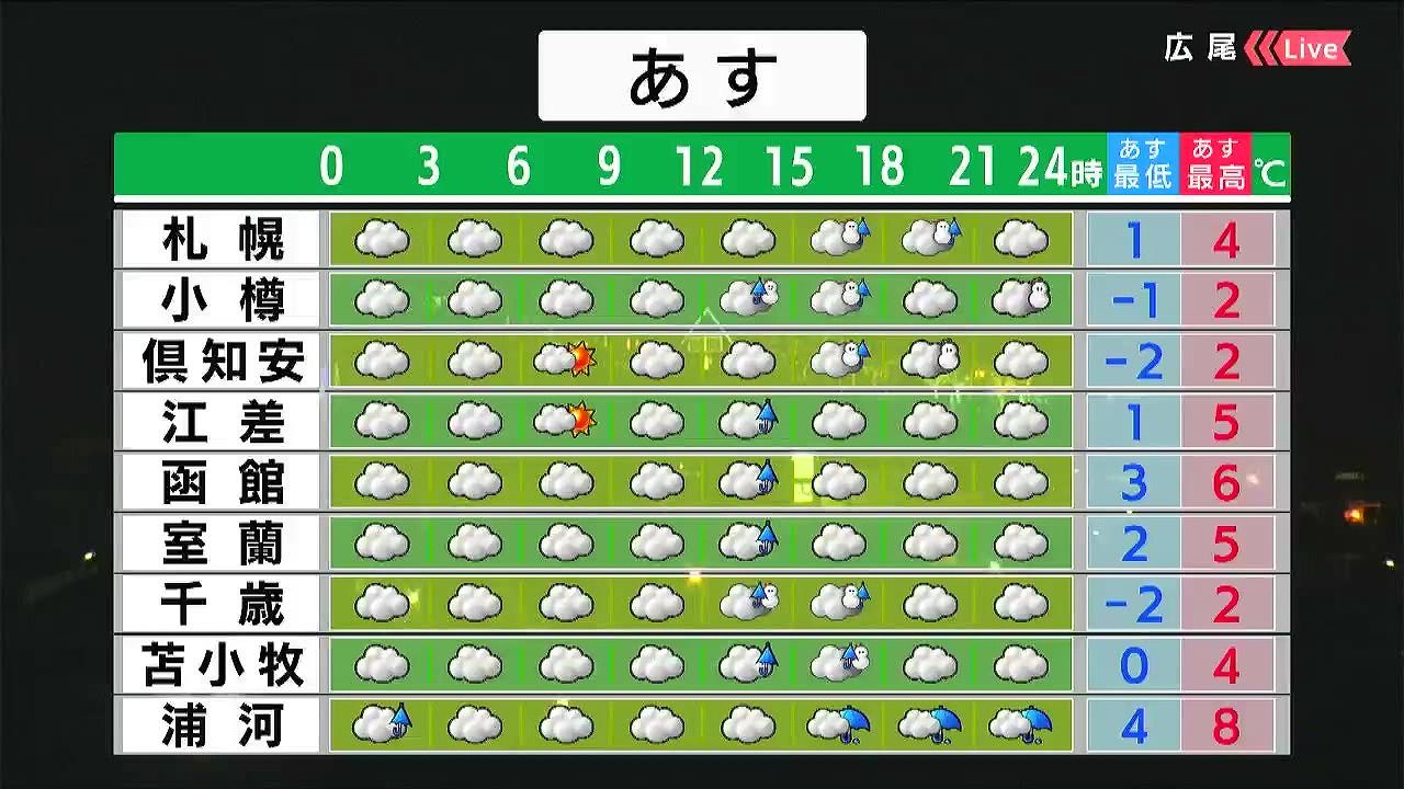 広く雨や湿った雪が降り、東部の内陸やオホーツク海側では5センチ前後の雪が降るでしょう。きょう24日(水)ほどではないですが、あす25日(木)も高めの気温が続きます。