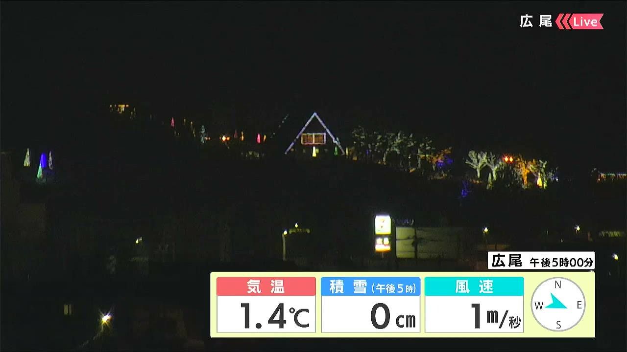 十勝、広尾町です。サンタランドの明かりが見えます。積雪はゼロですが、あす25日(木)夜は少し雪が積もりそうです。