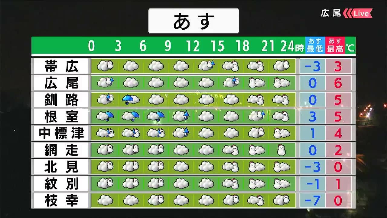 朝晩を中心に湿った雪が降るでしょう。夜はオホーツク海側を中心に雪の強まる時間がありそうです。路面状況の変化に注意して下さい。