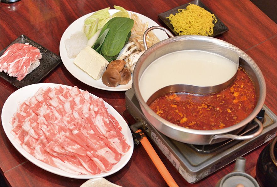 鍋はあっさり系のコンブだし、塩ダレ、濃厚な鶏白湯、麻辣火鍋の4種類から2種類を選べる。