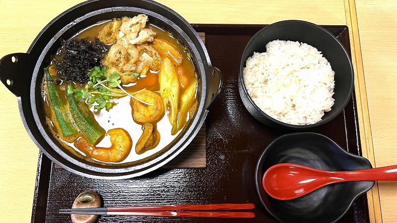 カレーは、いろり鍋に入っていて、麦飯のごはんは、おひつに入っている…!
