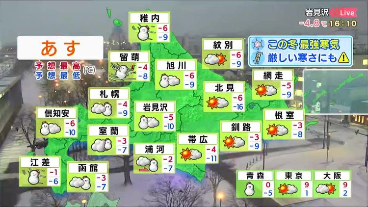 日本海側や道南は雪や風が強まりますが、東部は晴れるでしょう。強い寒気の影響で、この冬一番の寒さになります。朝は札幌で-9度と今シーズン一番の冷え込みに、日中も広く-5度前後でしょう。