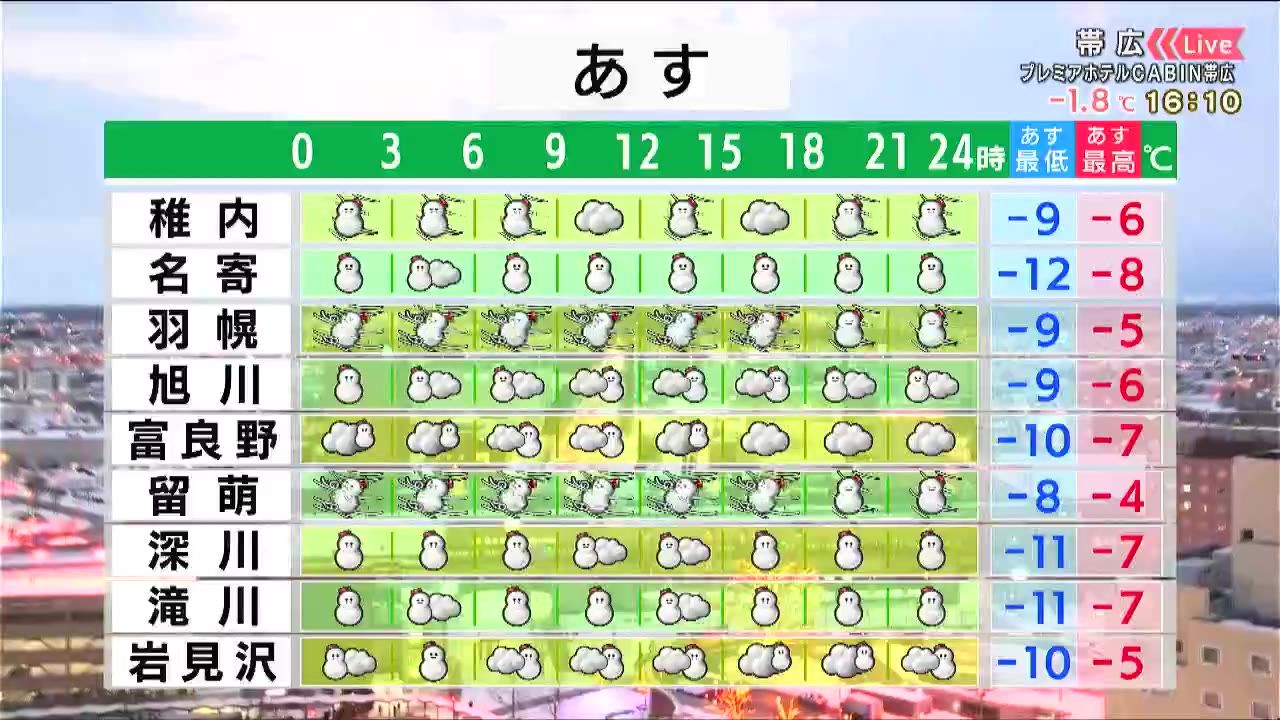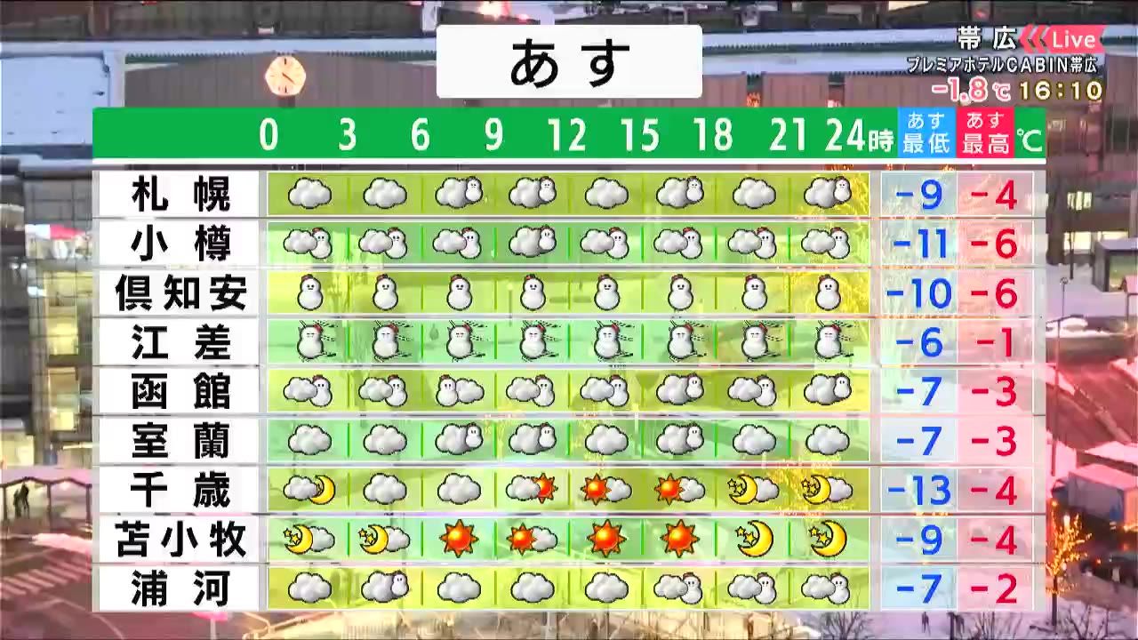 道央・道南です。札幌の雪は弱いですが、倶知安や函館など日中は強く降ったり、ふぶく時間があるでしょう。千歳は晴れますが、厳しい寒さです。