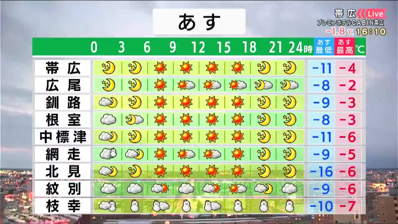 枝幸で雪が降る他は晴れますが、朝は-10度前後と冷え込みます。日中も厳しい寒さで、強く吹く風が痛いくらいに感じそうです。
