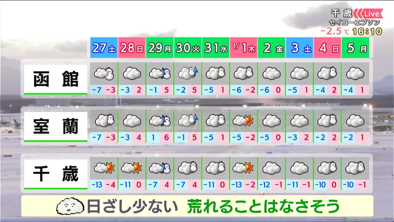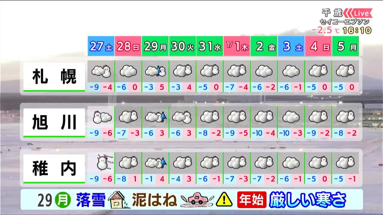 29日は気温が上がって雨が降るため、落雪や泥はねなどに注意して下さい。年始は寒さが厳しく、元日と4日は雪の強まるおそれがあります。
