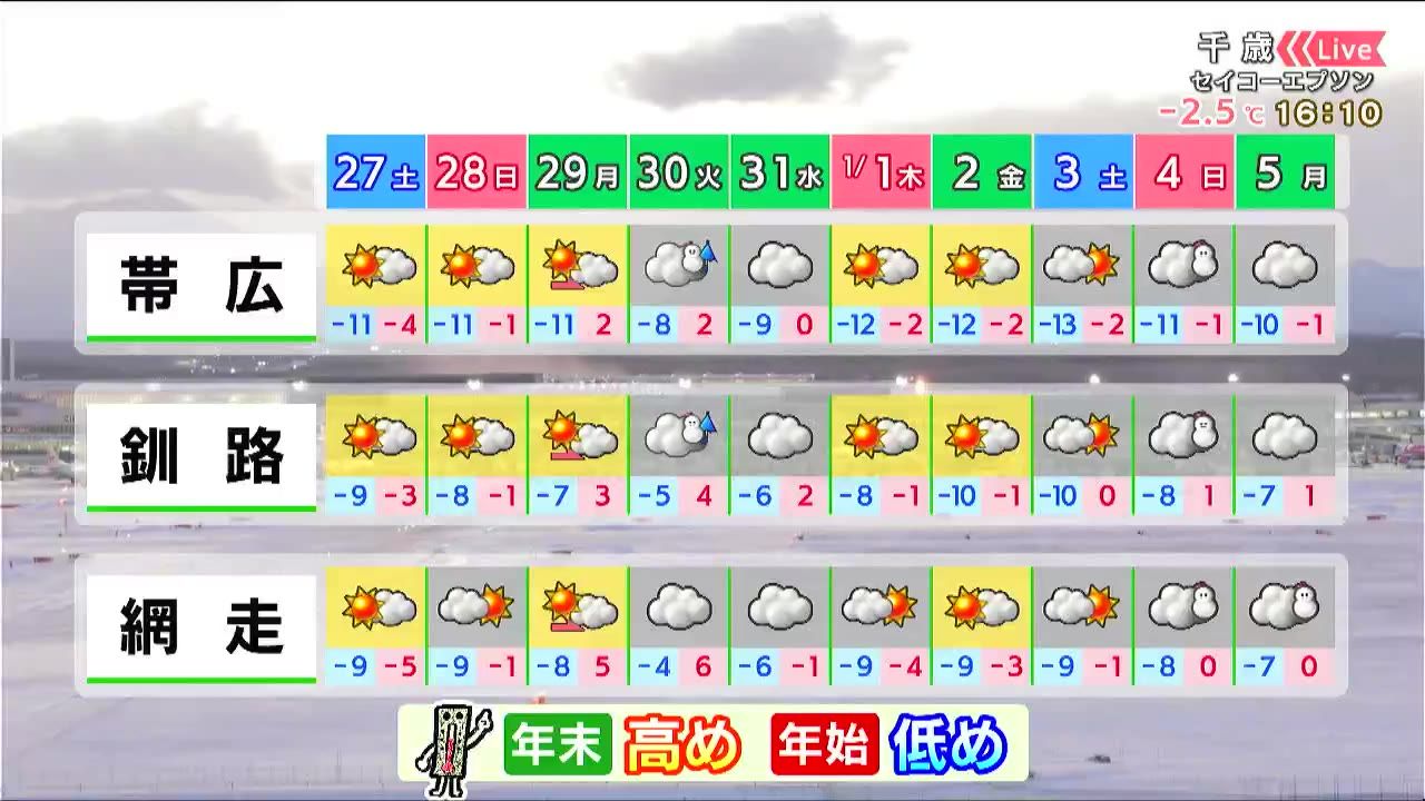 晴れる日が多くなりそうです。29日から30日は寒さが緩みますが、年始は真冬の寒さが戻り、午年だけに空気がヒヒ~ンやりしそうです。