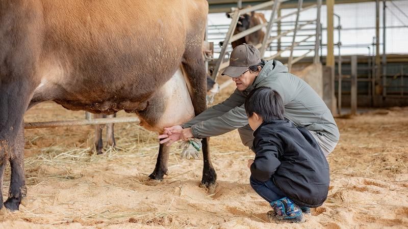 夏も冬も、一年中体験できちゃう「ジャージー牛の乳しぼり体験」。