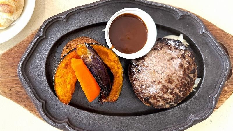「びえい和牛100%のてごねハンバーグステーキ」は、ジューシーな肉感がとってもぜいたくな逸品。付け合わせのお野菜もおいしい!