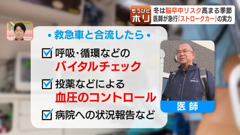あらかじめ決めてある合流地点に、医師が「ストロークカー」で急行し、救急車に乗り込み、医療処置しながら搬送する取り組みです。
