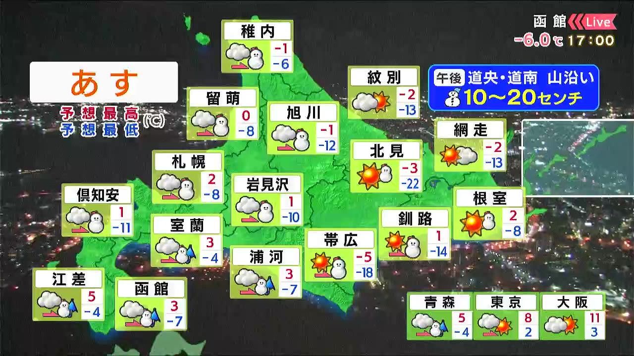 午後は広く雪や雨で、渡島半島の山沿いや胆振の山沿い、日高山脈周辺などで10~20センチの雪が降るでしょう。湿った雪による電線などへの着雪にも注意して下さい。朝の冷え込みは続きますが、日中の寒さは少し緩みます。