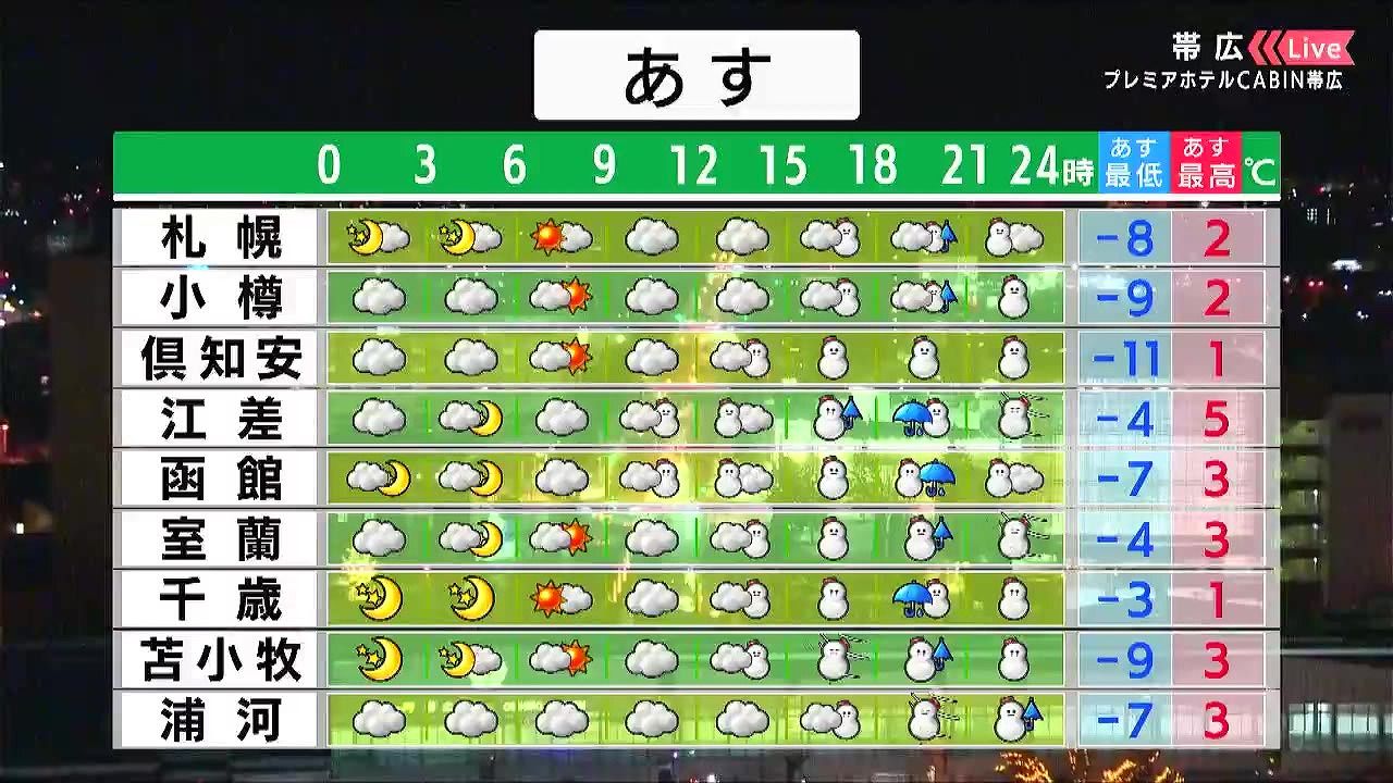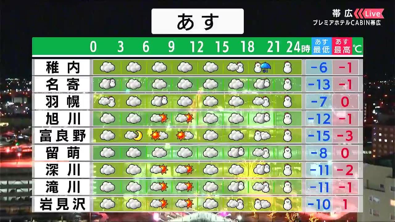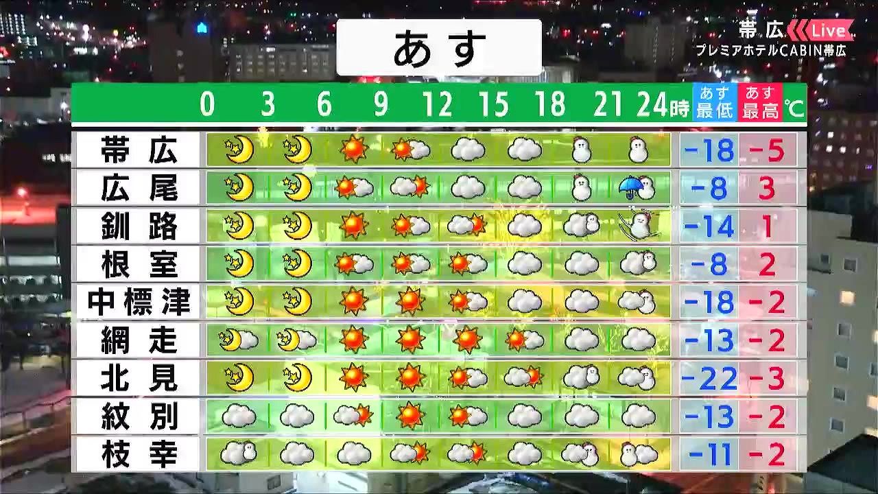 広く晴れますが、夜は広く天気が崩れ、十勝地方で雪が強まります。また、夜は風も強まり、釧路など海岸部はふぶくでしょう。十勝の陸別町ではあす7日(水)朝も‐25度を下回りそうです。