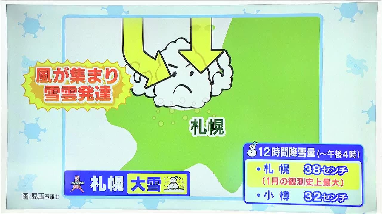 きょう8日(木)は北風に乗って雪雲が流れ込みました。石狩湾は「すり鉢状」になっているため、積丹半島の方からも風が集まって雪雲が発達し、局地的な大雪になりました。午後4時までの12時間で、札幌では1月の観測史上最大となる38センチの雪が降りました。