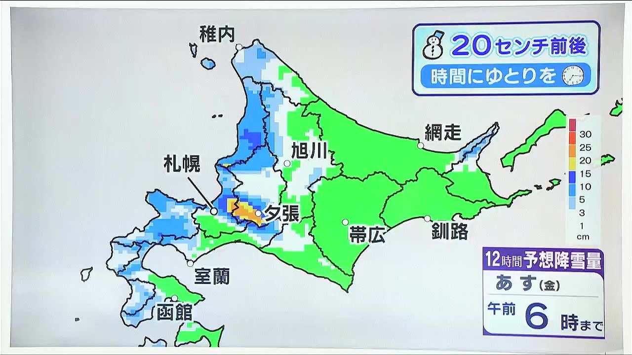 札幌中心部の雪のピークはあと3時間程度ですが、まだ今夜も札幌周辺で雪が強まります。今夜の予想降雪量は、札幌の少し北の地域から夕張など南空知で20センチくらいでしょう。あす9日(金)も時間にゆとりを持って出かけましょう。札幌では、雪のピークは過ぎてもきょう8日(木)の大雪の影響が残るため、あす9日(金)も早めに支度をしましょう。