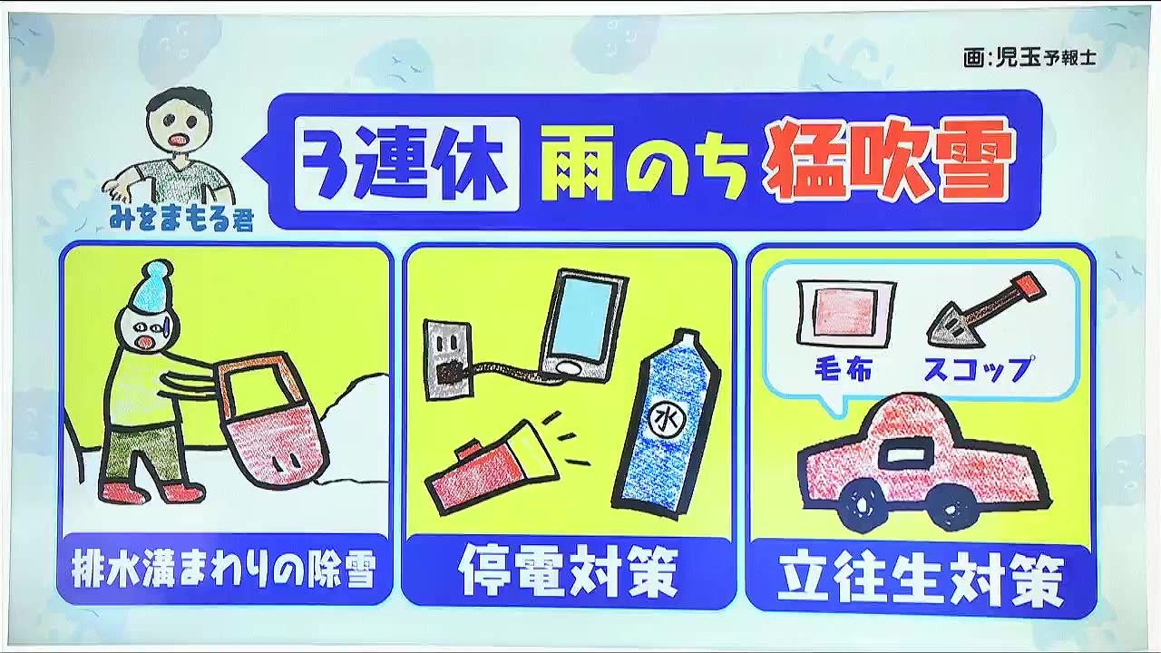 日頃からの備えを教えてくれる、みをまもる君。3連休は雨のち猛吹雪です。