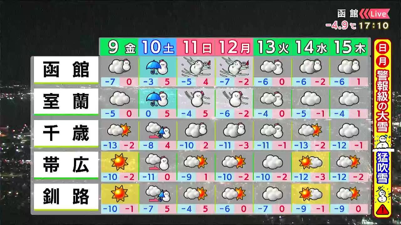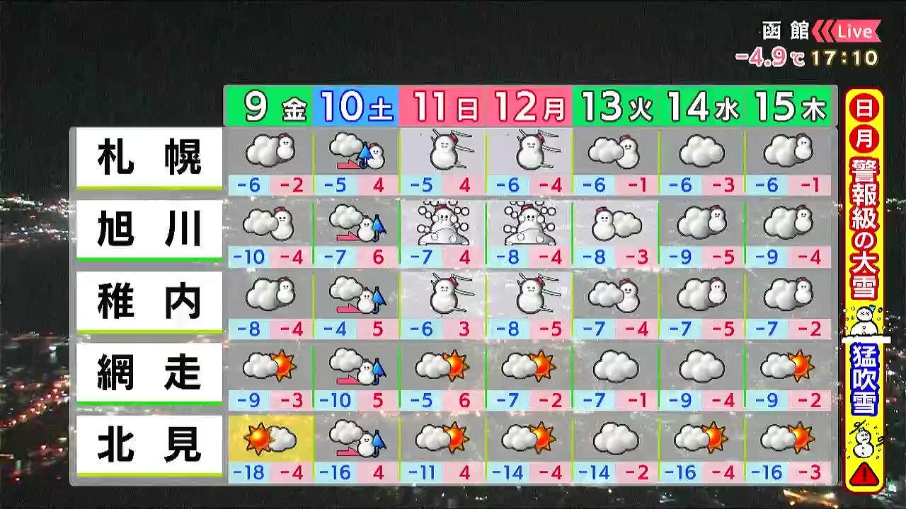 ※8日午後5時時点の情報です。最新の気象情報は、HBCウェザーセンターのホームページなどでご確認ください。HBCは気象庁の認可を2001年に得て以来、民間気象会社の一つとして「HBCの独自予報」を発信しています。