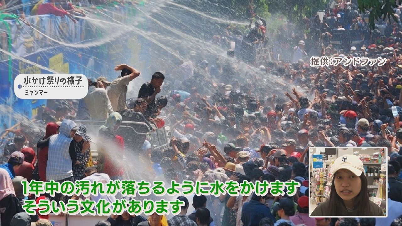 番組スタッフ:「ミャンマーの正月は?」サンさん:「4月です。1年中の汚れが落ちるように水をかけます。そういう文化があります。『お世話になりました!』みたいな意味です」