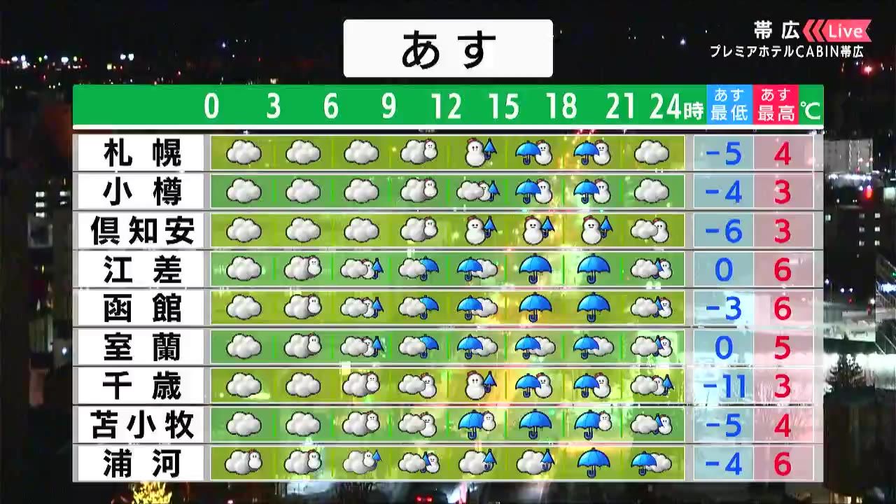 午後は太平洋側を中心に雪や雨が降り、夜は海岸部で傘がさせないほどの風を伴います。帯広は寒さが続きますが、その他は広くプラスの気温になるでしょう。