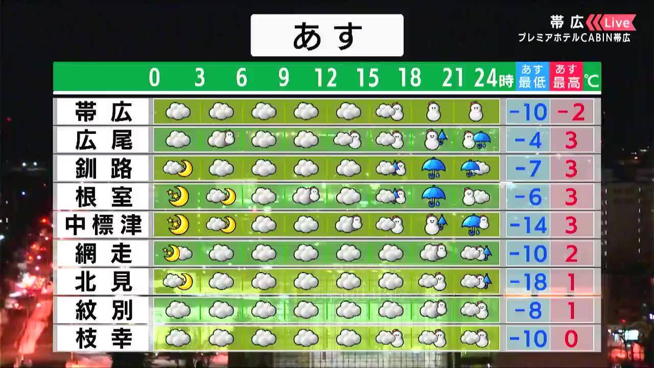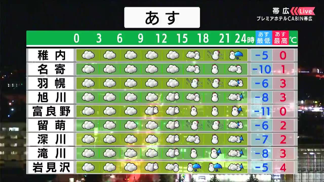 帯広ではあす10日(土)午後、2週間ぶりに5センチ以上の雪が降り、少し雪かきが必要になります。