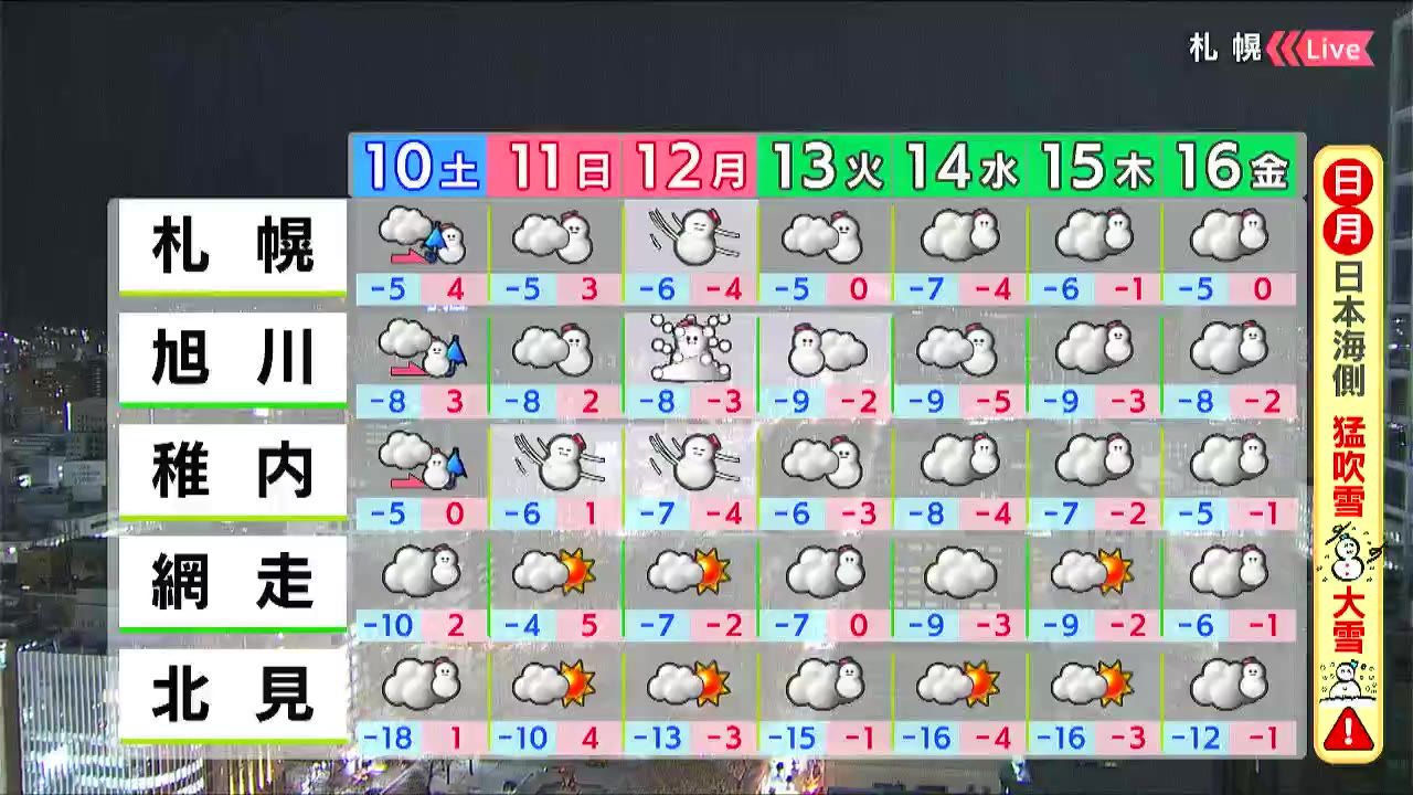 日曜から月曜は日本海側で猛吹雪や警報級の大雪となるおそれがあります。札幌も日曜と月曜はふぶく時間があるでしょう。日曜の午後は気温が急降下します。