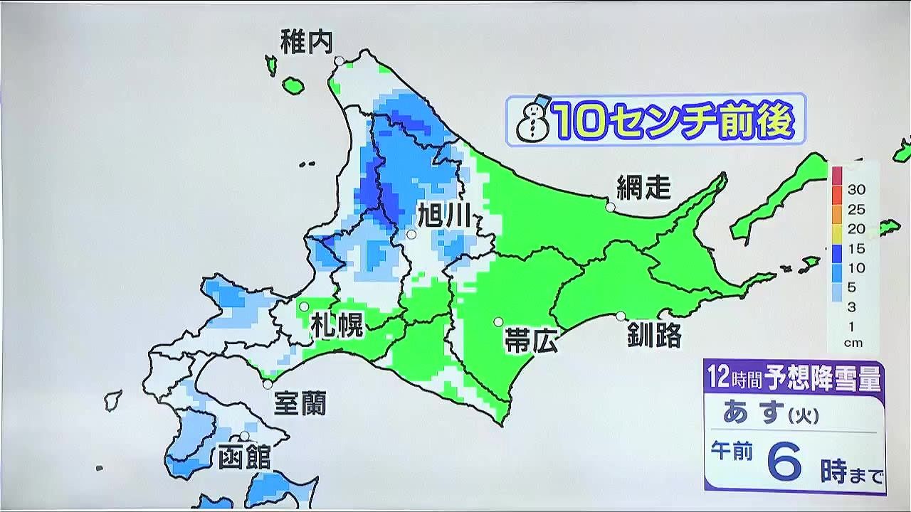 あす13日(火)朝6時までの12時間に降る雪の量は、濃い青のエリア、上川北部や宗谷南部など多いところでも10センチ前後で大雪になることはないでしょう。