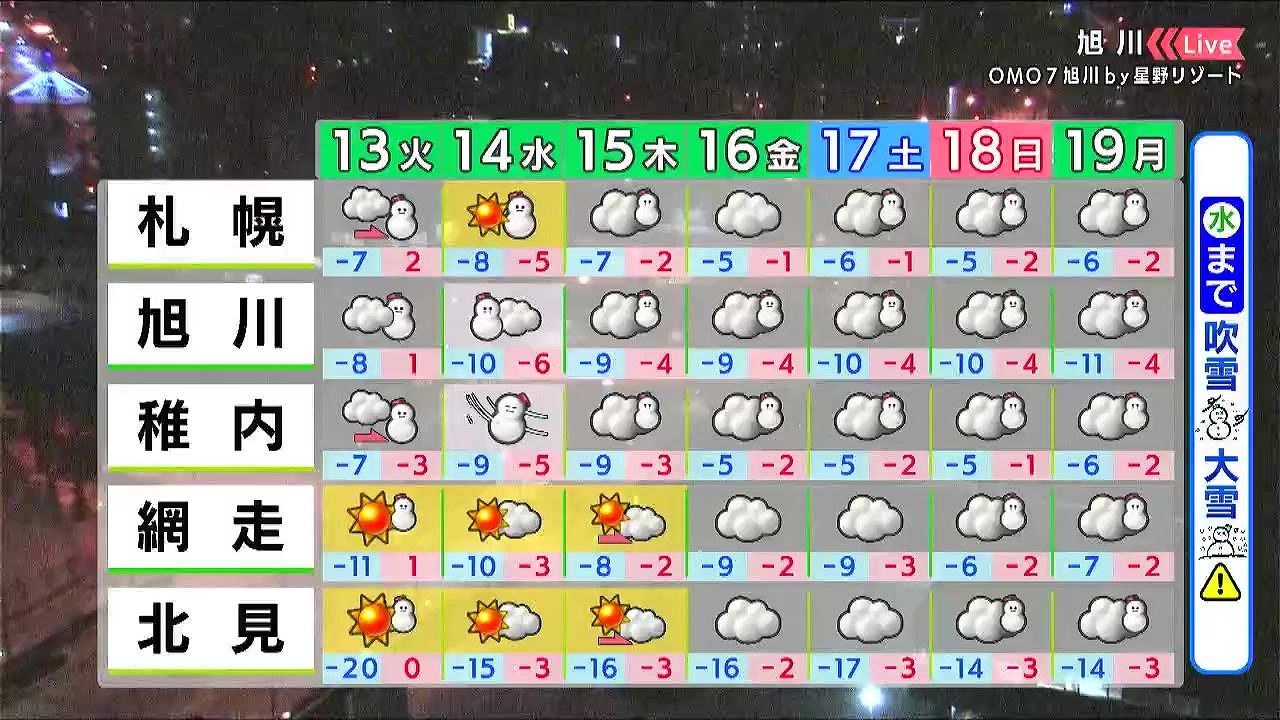 水曜は再び冬型の気圧配置が強まり、日本海側で大雪や警報級の吹雪となるおそれがあります。札幌やオホーツク海側は水曜、晴れ間があるでしょう。水曜日以降、真冬日が多くなります。
