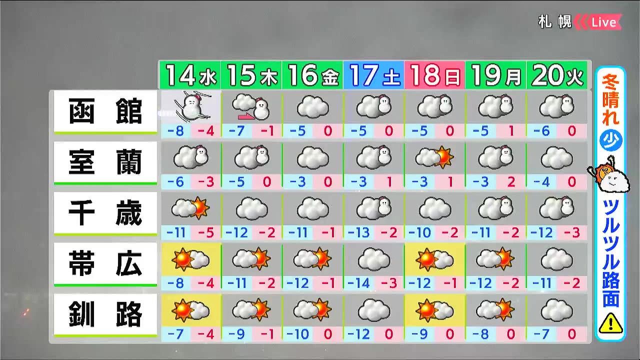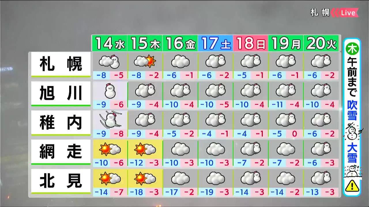 札幌は一気に積雪が増えそうです。あす14日(水)は早めに支度をしましょう。