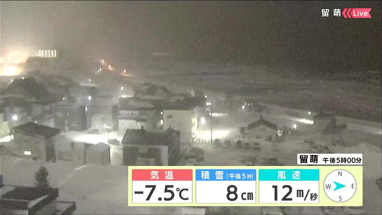 留萌はきのう13日(火)から断続的に雪が降っています。風が強く、海は白波が立っています。観測上、積雪は8センチですが、風が強いので場所によっては吹きだまりで雪が多くなっているおそれがあります。車の運転は気を付けて下さい。