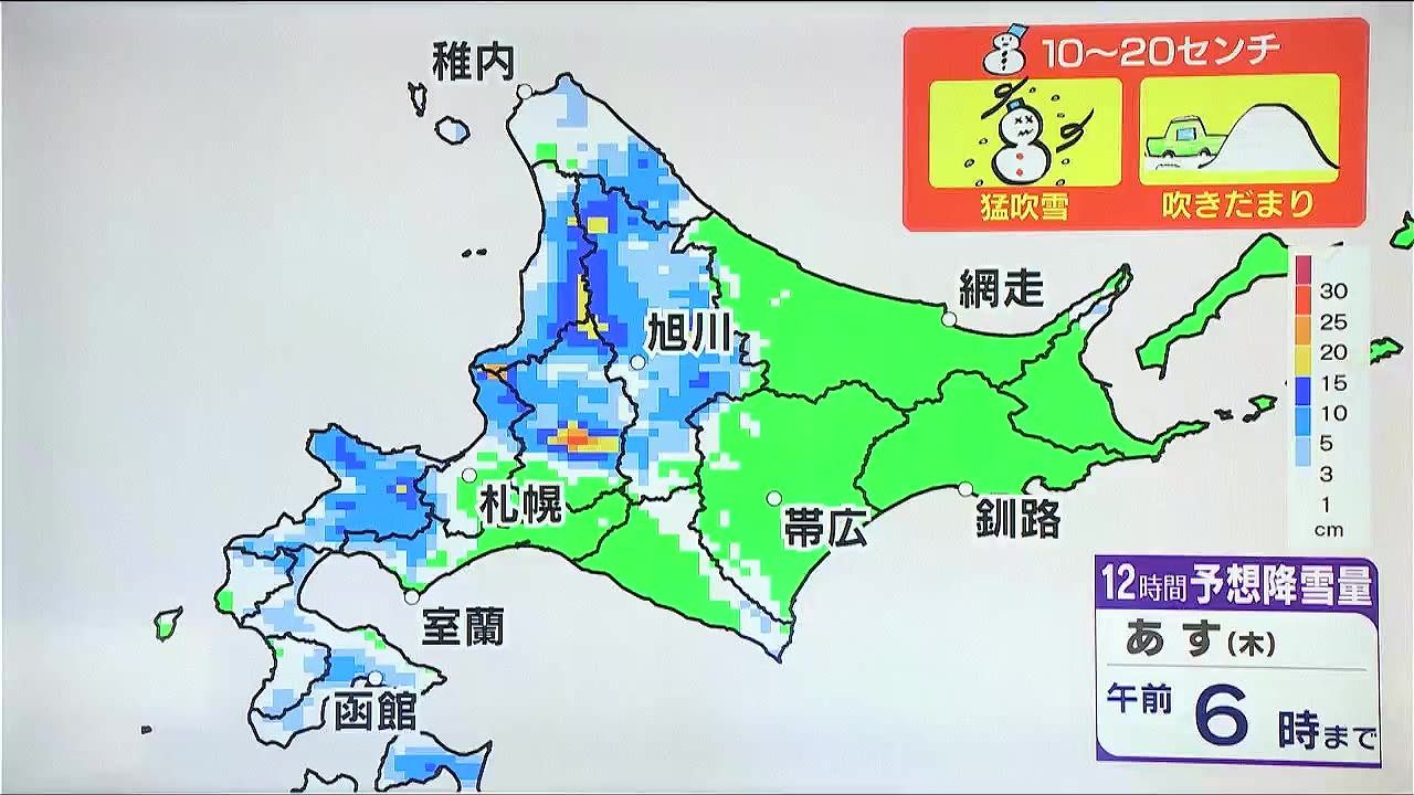 動きの遅い低気圧が北海道付近の北にあって、道内は荒れた天気が続いています。あす15日(木)朝6時までの12時間に降る雪の量は、上川や空知、後志地方など内陸の多いところで10~20センチです。極端な大雪にはなりませんが、猛吹雪に警戒が必要です。