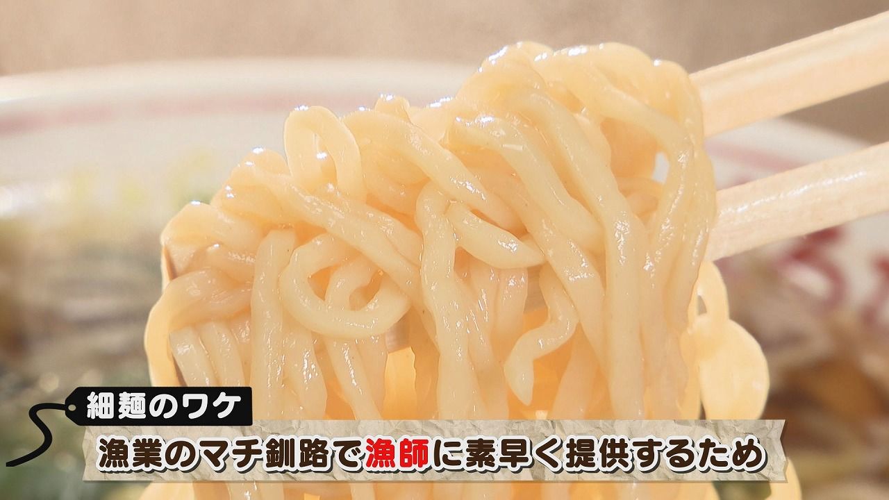 釧路は漁業が盛んだから、漁師に素早く提供するためにこの細麺になったといわれているんだよ。