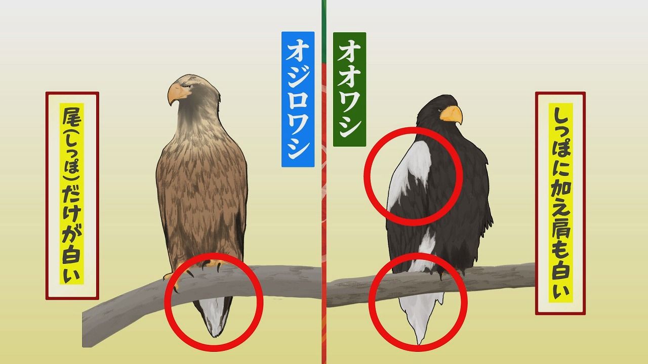 オオワシは、肩としっぽが白いのに対しオジロワシは、しっぽだけが白いんだ~。